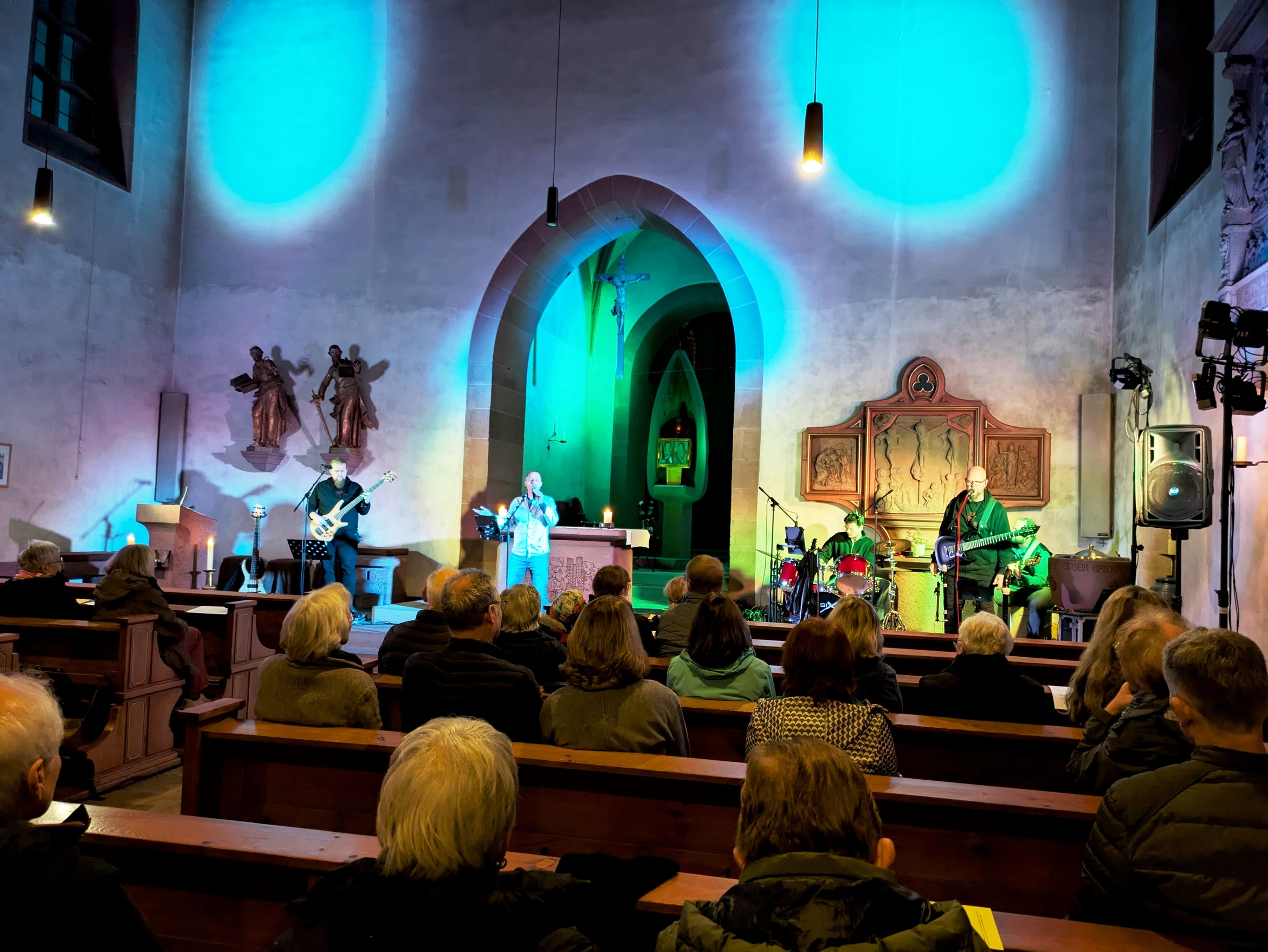 Kidron - Musik geht über die Berge und durch die Täler des Lebens und des Glaubens. Sie ist Ewigkeitsmusik und lädt ein zum Tiefhören statt Durchhören. Mystische und spirituelle Rock – Musik erklang bei den Abendgesängen im Pastoralen Raum Gemünden, feinfühlig arrangiert, tiefgehend getextet, meditativ gespielt. Manchmal laut und rhythmisch, manchmal leise und differenziert, das Publikum immer wieder mit einbeziehend zaubern die fünf Musiker und der Mann für den Sound eine gute und stimmige Atmosphäre. Viel mehr als ein „Halleluja“ entsteht, wenn Kidron den „Stecker in die Harfe“ steckt. Kidron (Sänger Matthew, Bassist Jonas, Schlagzeuger Jannik, Sologitarrist und Flöten Andreas und Rhythmus- und Solo-Gitarre Christian, Mischpult Achim) gründete sich 1989 und zählt zu den am längsten bestehenden Kirchenbands im Bistum Erfurt.