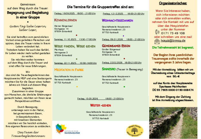 Offene Angebote finden Sie hier: https://www.hospiz-msp.de/Trauerbegleitung/trauerbegleitung.html